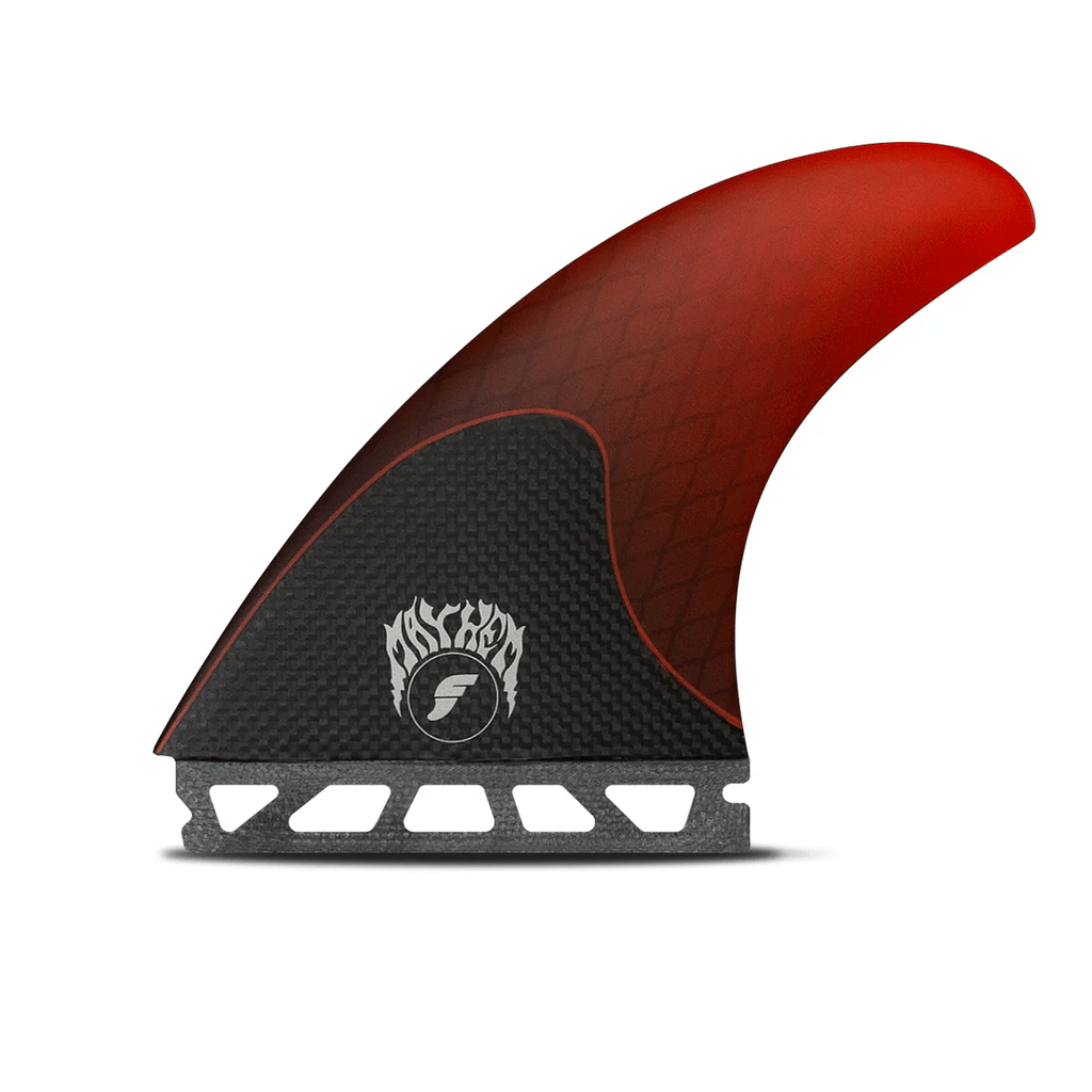 “The Mayhem 3.0 is an all new template. With the trends in modern HP shortboards going towards more curve under the rear foot for critical pocket surfing, we felt the need for the fins to evolve with the board rockers. We wanted to add a bit more base, with more rake and a narrower tapered tip than our long-standing thruster template.